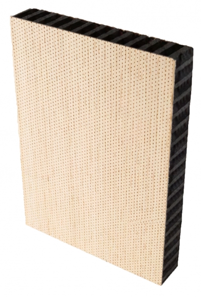 A core of 16 mm in black moisture repellent MDF with acoustic absorbing non woven glass fibre tissue in the center.