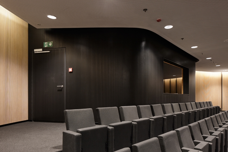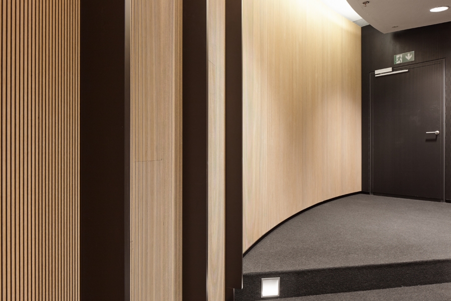 Panneaux acoustiques absorbants type F avec finition vernis ainsi que finition lacquage dans une auditoire