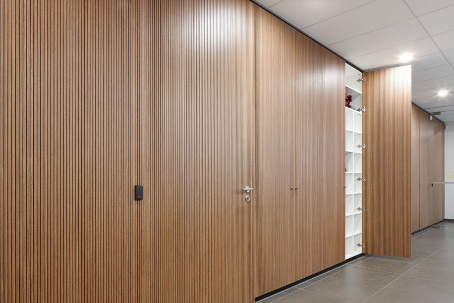 Les portes d’armoire acoustiques absorbantes sont perforées dans l’âme de manière à optimiser la capacité d’absorption. Afin de garantir la stabilité des portes d’armoire, nous les avons pourvues d’un châssis fermé de +/- 50 mm dans l’âme, en fonction de la taille, et de 1 ou 2 traverses horizontales. Grâce à l’âme en MDF acoustique noir, celui-ci est presque invisible.