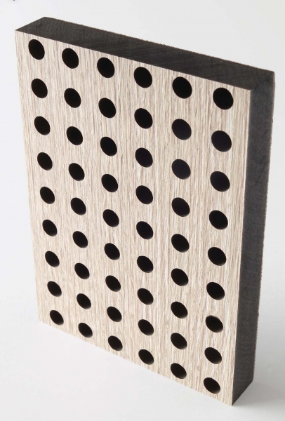 De akoestisch dempende panelen Type B combineren een patroon van doorgaande boringen met een bepaalde perforatiegraad - verschillende mogelijkheden. Ze bestaan uit een zwarte waterwerende MDF-kern van 16 mm - op aanvraag zwarte brandvertragende MDF of multiplex berk CP/CP, vuren of populier - met een akoestisch dempend glasvlies op de rugzijde en eentoplaag in één van de zes standaard edelfineren of in één van de 18 reeds volledig afgewerkte fineren van Shinnoki®.