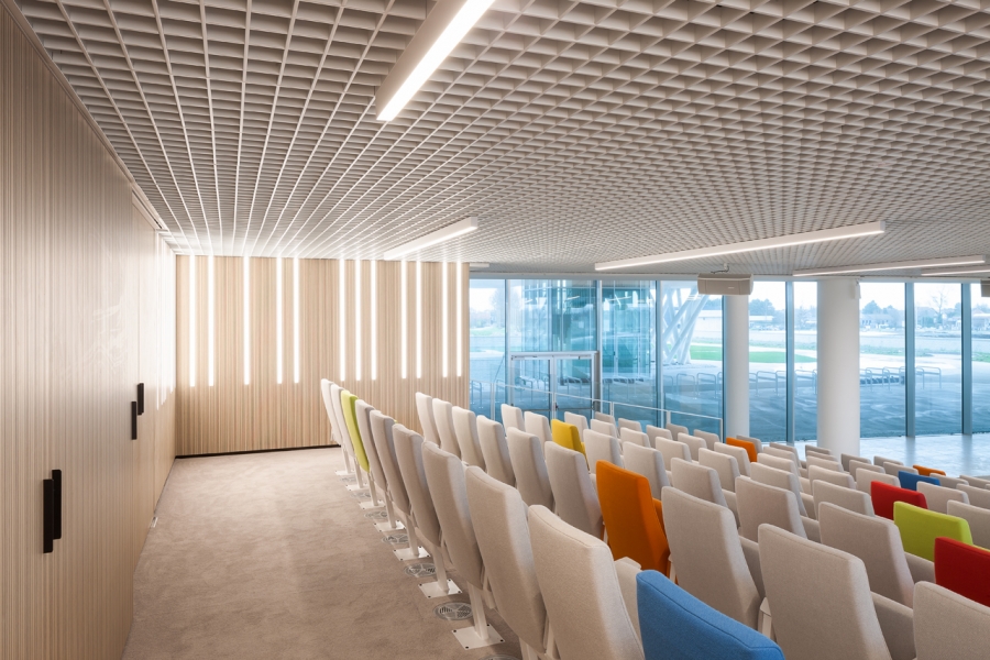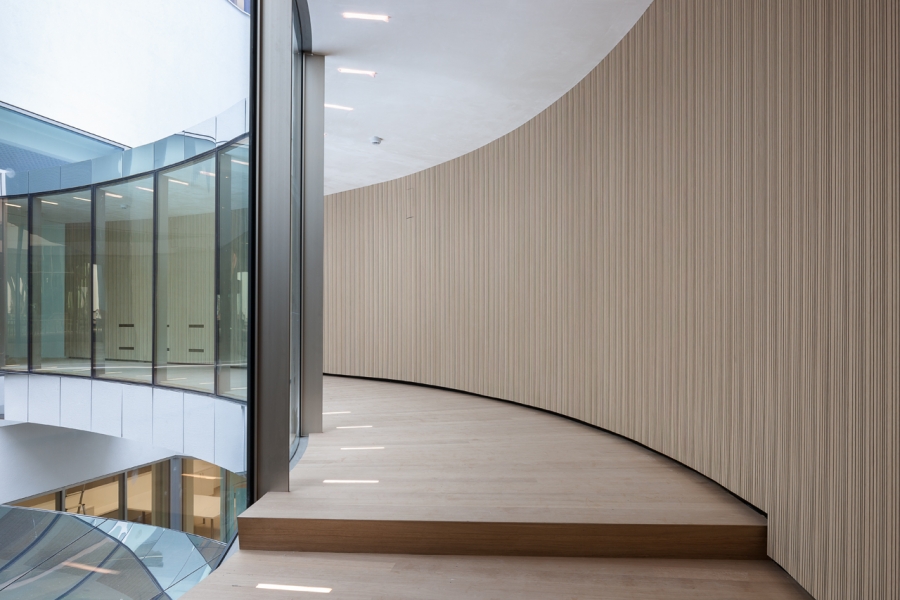 Akoestisch absorberende panelen type Dr in de aula en trappenhal