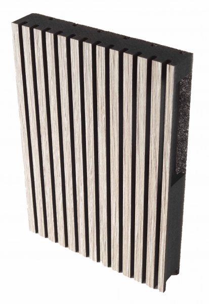 The acoustic absorbing panels Type F are equipped with standard 16 % of continuous slits, a blade of 13.2 mm and a groove of 2.8 mm. They consist of a black moisture repellent core in MDF of 16 mm - on request black fireretardant MDF - with an acoustic absorbing non woven glass fibre tissue on the back and a top layer in one of the six standard veneers or finished in one of the 18 prefinished veneers of the Shinnoki® range.