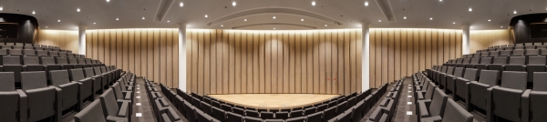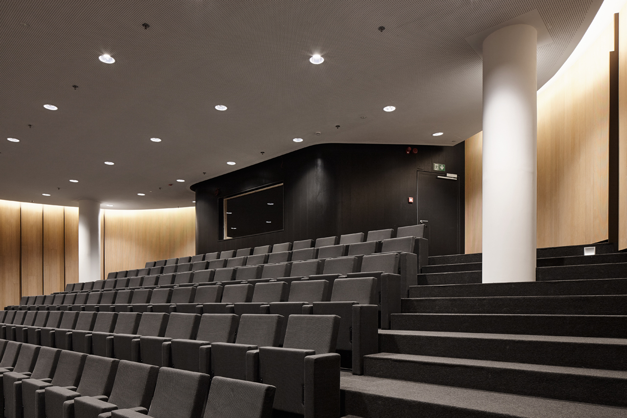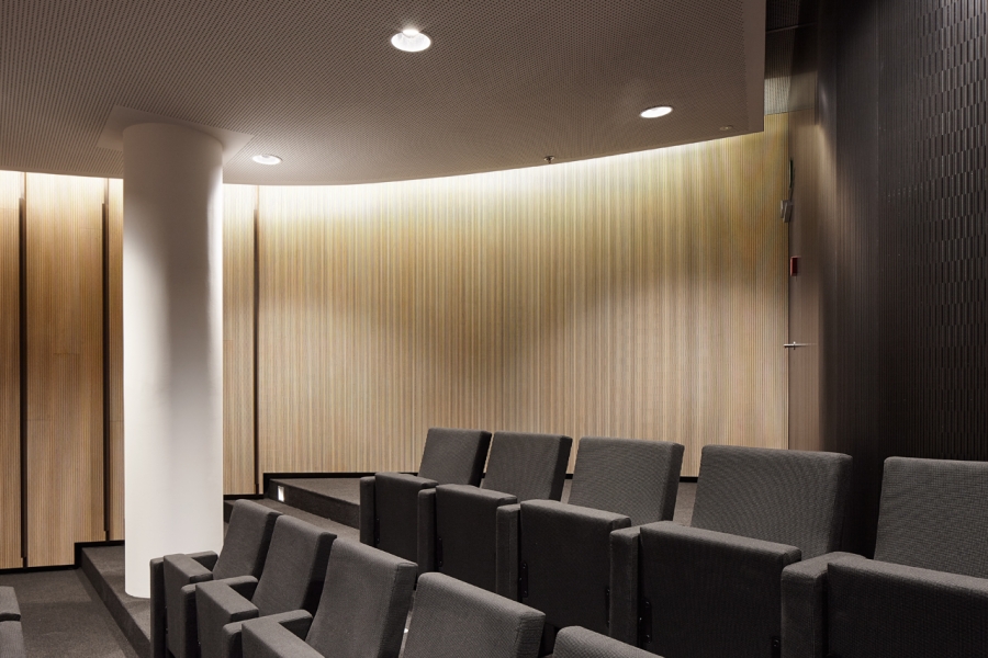 Panneaux acoustiques absorbants type F avec finition vernis ainsi que finition lacquage dans une auditoire