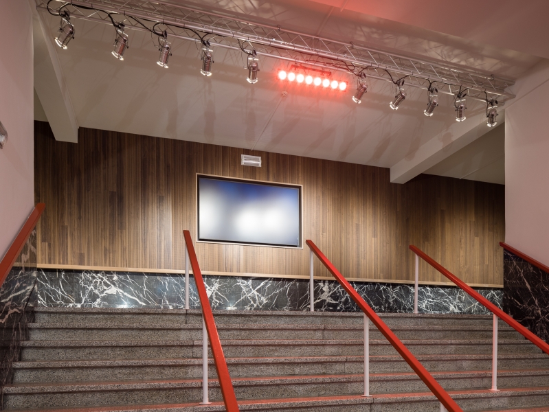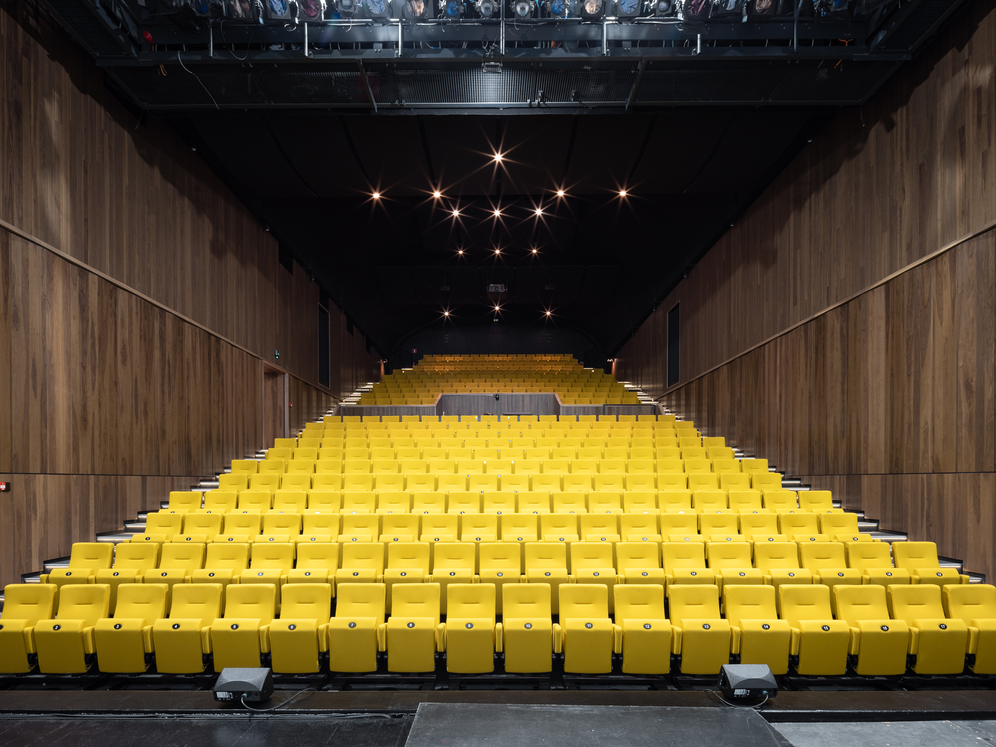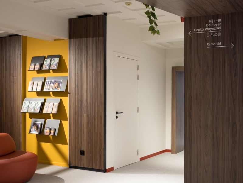 Murs Théatre et acceuil en panneaux acoustiques type Dr Shinnoki Smoked Walnut et Pnx Nanoperforés Shinnoki Raven Oak