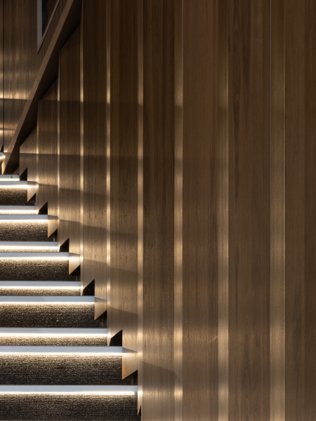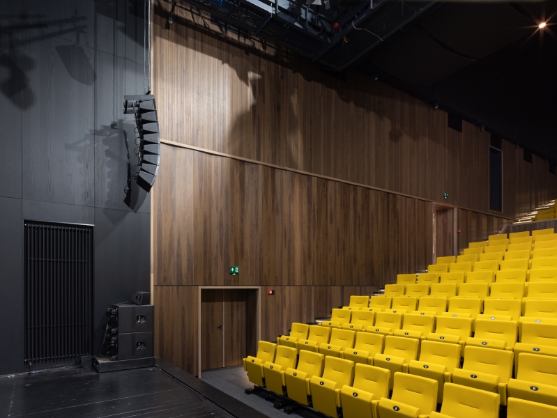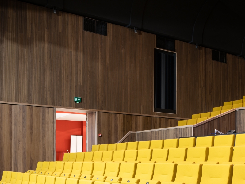 Walls Theatre and entrance hall in acoustic panels type Dr Shinnoki Smoked Walnut and Nanoperforated panels Shinnoki Raven Oak