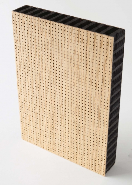 Les panneaux acoustiques Type M ont standard 4,7 % microperforations d'un diamètre de 1,1 mm (linéaire 3/3/1,1). Ils consistent d'un ame MDF noir hydro de 16 mm - sur demande MDF ignifuge noir - avec voile acoustique en fibre de verre au centre et une finition dans un des six placages acou standard en 6 essences ou selon un des 18 placages préfinis de gamme Shinnoki®.