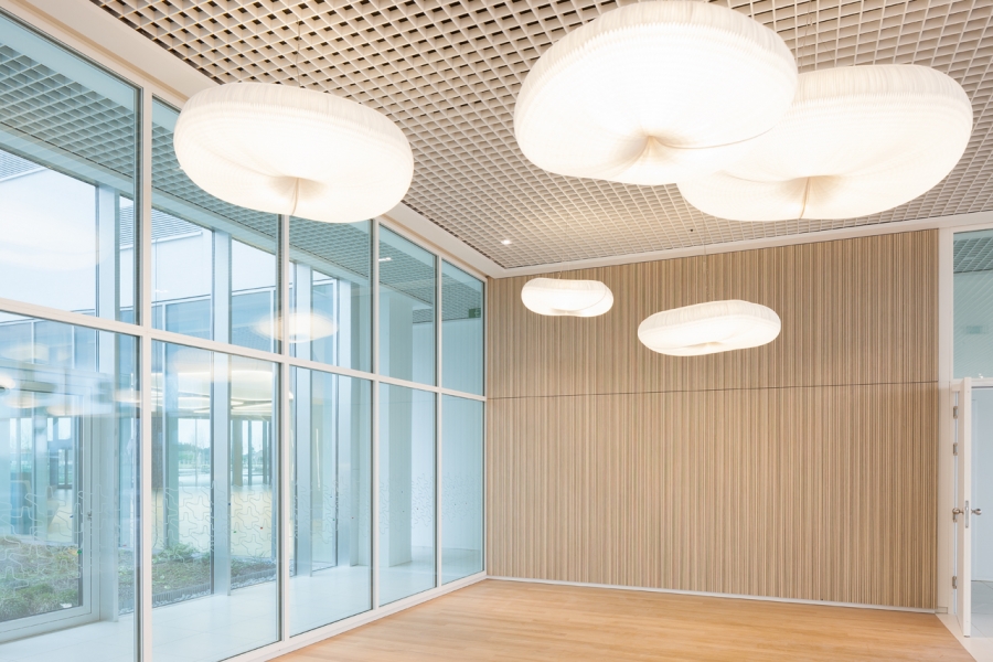 Akoestisch absorberende panelen type Dr in de aula en trappenhal